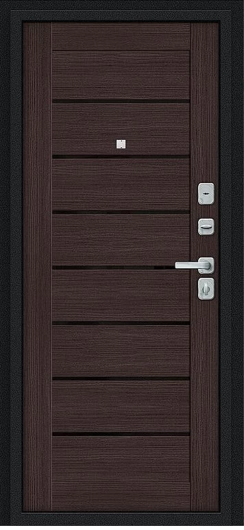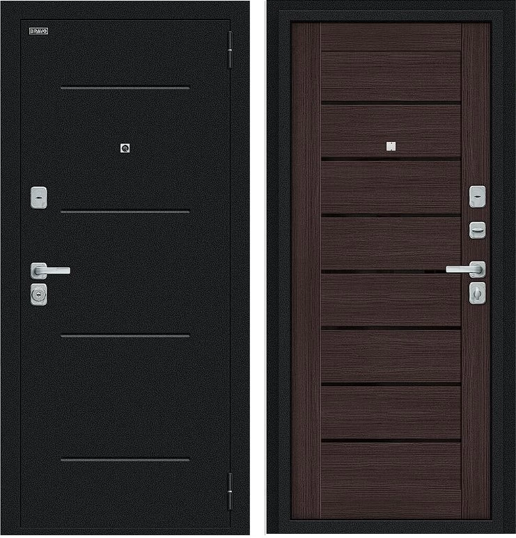 Надежная входная Дверь Браво Техно/BChrome Букле черное/Wenge Melinga премиум класса по цене 35 260 руб. Большая толщина стали защитит от проникновения в ваш дом, квартиру или коттедж. Используется очень качественная фурнитура: замки, цилиндры, ручки, защелки. Покрытие и отделка двери изготовлено под внимательным контролем производителя. Дверь имеет долгий срок службы и гарантию.